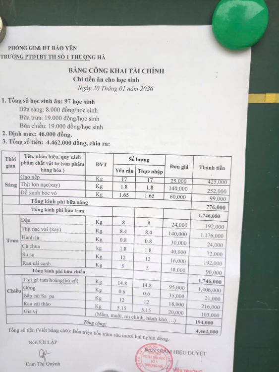 Công khai bữa ăn 20/1