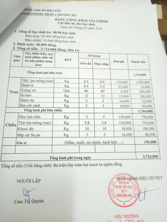 Công khai bữa ăn 9/3/2026