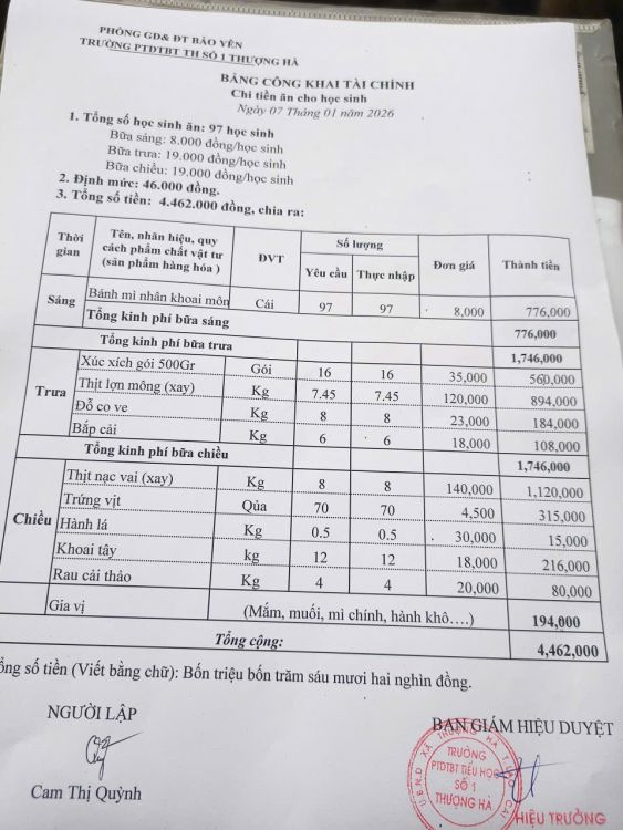 Công khai bữa ăn bán trú 7/1/2026